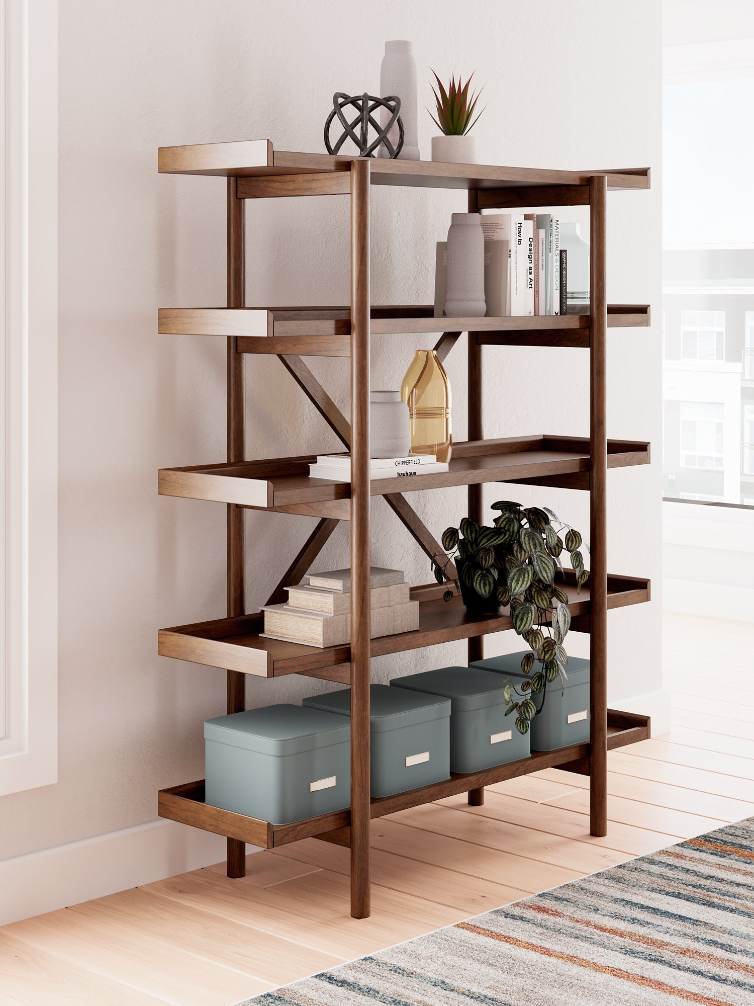A refreshed take on retro aesthetics. This bookcase adds an air of playful simplicity to your home, capturing the architectural language of mid-century stylings. Subtle in design, it invites the eye with a sleek, open frame. A casual, yet timeless, finish and five gallery shelves stack up for great form and function.