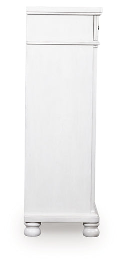 Taking a laid-back approach to casual traditional design, this artfully crafted chest of drawers combines classic elements with a clean modern approach. Its rubbed antiqued white finish exudes a comfy, timeless appeal that's sure to carry you away to a dreamy time and place. Simple round metal knobs and ring pulls on the chest's spacious drawers make just the right statement.